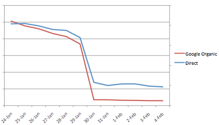 I was very interested to read this article by Gene McKenna from Groupon that was posted to Search Engine Land last week, as were a lot of people. This article says that when Groupon de-indexed themselves from Google that 60% of their direct traffic to long URLs (i.e. not likely to be typed-in) turned out to actually be organic traffic, since it disappeared while they were de-indexed. I had noticed the same thing in the past with sites that had serious Google penalties, which has effectively the same result as intentionally de-indexing yourself, but never computed the percentage. I proceeded to test one of these penalties and found almost exactly the same number, a 59% loss of direct traffic.